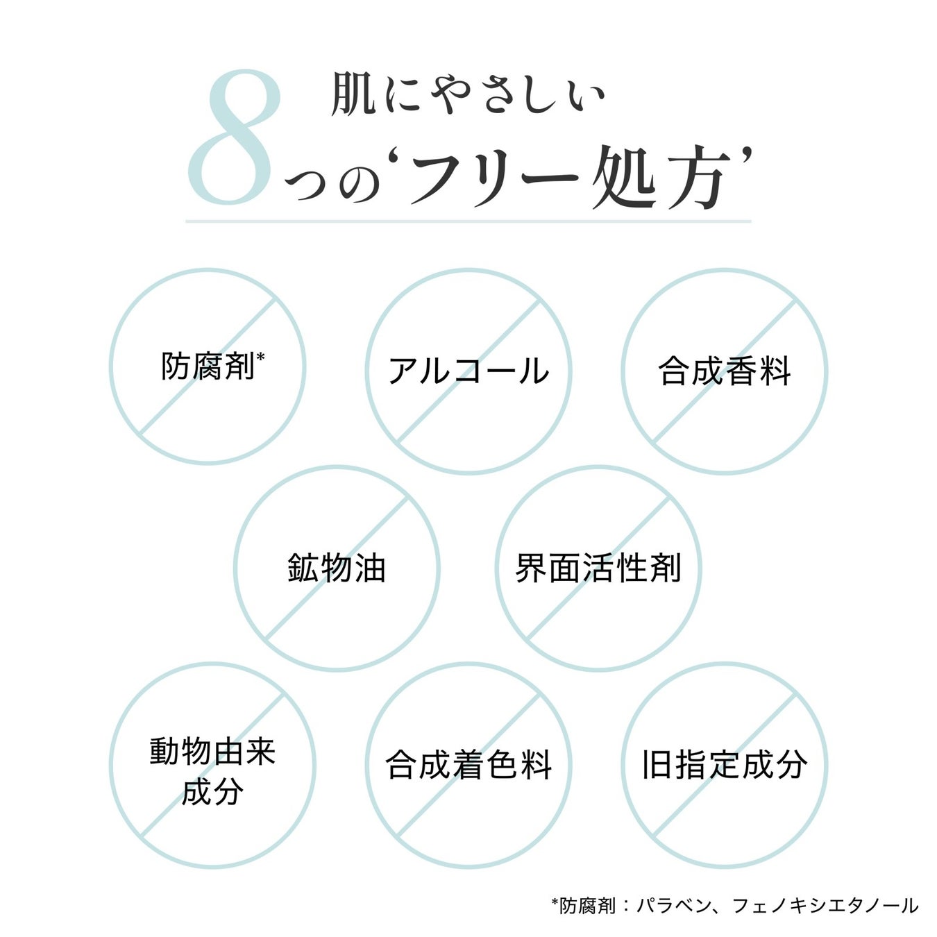 防腐剤(パラベン・フェノキシエタノール)や界面活性剤をはじめとする8つのフリー処方を実現。敏感な肌にもやさしい処方でありながら、確かな効果をお届けします。