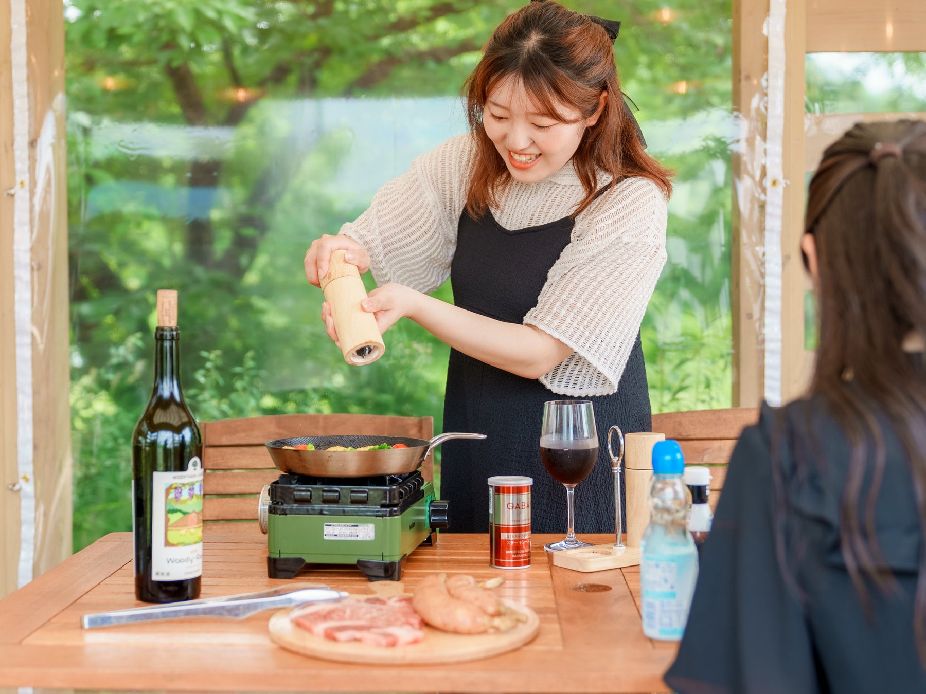 暑い夏のアウトドア体験を快適にするため、生ビールやサワーなどのアルコール各種、ジュースなどが飲み放題となるプランをご用意しました。涼を感じながら、開放的なグランピング空間を満喫できます。