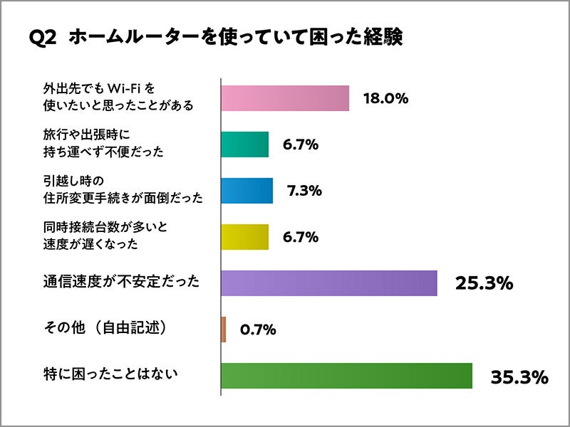 ホームルーター利用時の不便さについて聞いたところ、「特に困ったことはない」と回答した人は35.3%にとどまり、約6割以上の利用者が何らかの不便さを感じた経験があることが分かりました。