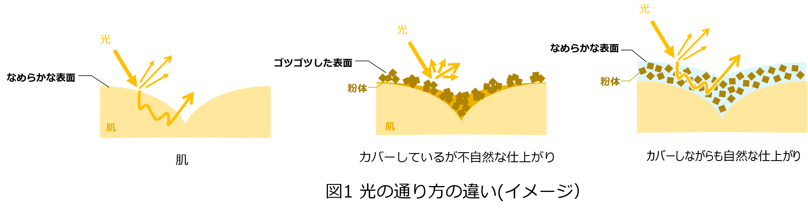 ファンデーションには、肌悩みをカバーするために光を反射・散乱させる粉体(白色顔料など)が配合されています。しっかりカバーしようとすると、それらの粉体が肌に多くのり、塗膜表面に露出することでゴツゴツしたり、光の多くが表面で反射・散乱したりすることによって粉っぽさや白浮きなどが生じます。そのため、これまで高いカバー力と自然さを同時に達成することは非常に困難でした。