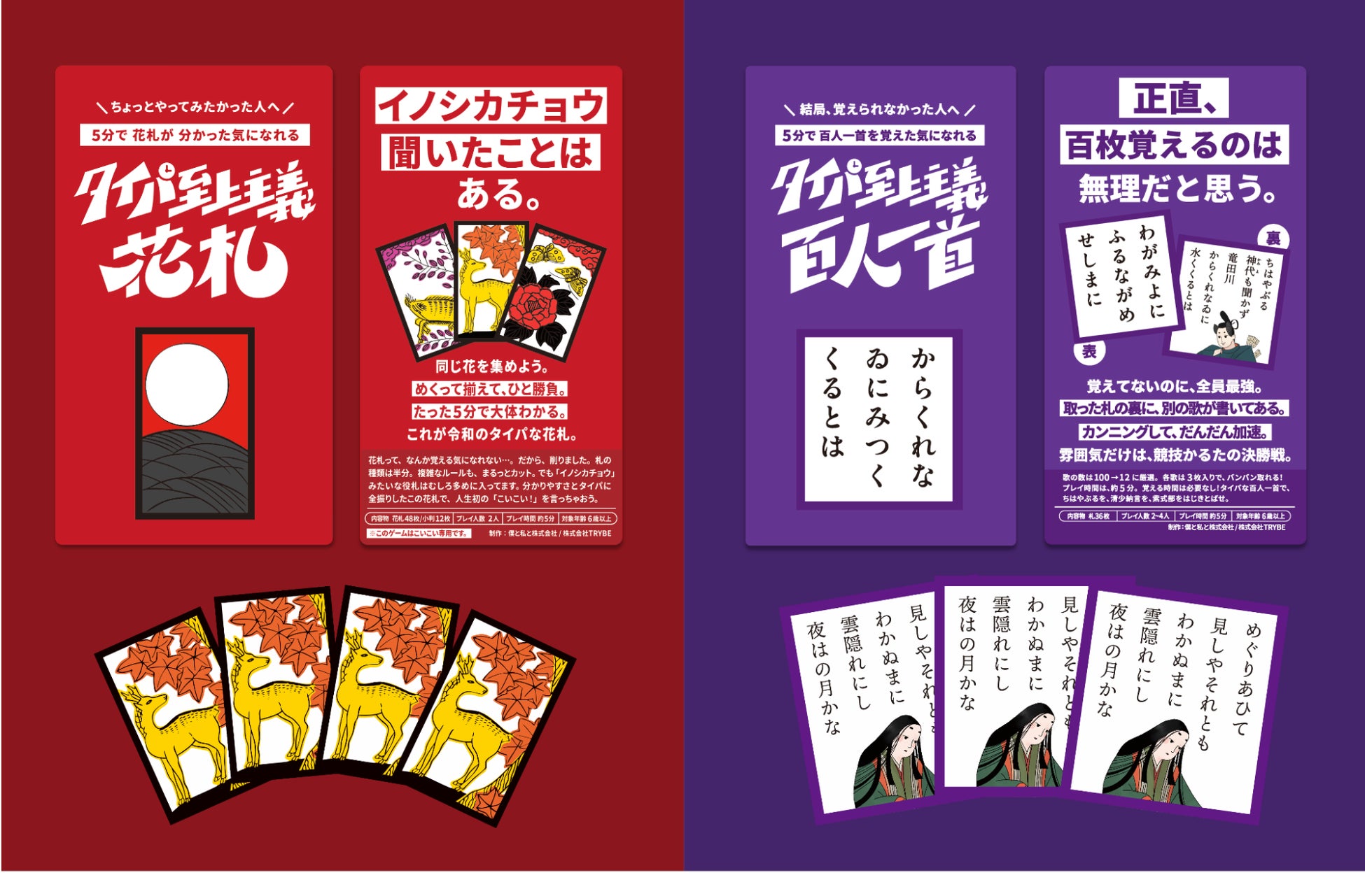 Z世代向けの企画・マーケティングを行う『僕と私と株式会社』は、Z世代向けのゲームブランドを企画・運営する『株式会社TRYBE』と共同企画し、「タイパ至上主義シリーズ」の最新作『タイパ至上主義花札』『タイパ至上主義百人一首』を2025年5月19日(月)に発売いたします。