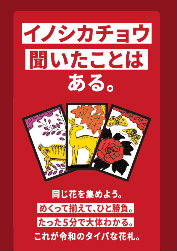 「花札」とは、四季折々の絵柄が描かれた札を使い、役を揃えて勝負する日本の伝統ゲームです。ゲーム名は知っていても、ルールが今いち分からない人にピッタリ。めくって揃えて、ひと勝負。令和の“タイパな花札”です。