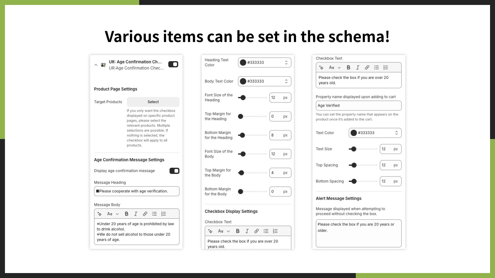 「UR: Age Confirmation Checkbox App」では、年齢確認のチェックボックスのテキストやデザイン、アラート表示のカスタマイズなどの項目をノーコードでカスタマイズできます。難しい設定は必要ないので、コード編集の知識がない方でも簡単にストアに合わせて調整可能です。
