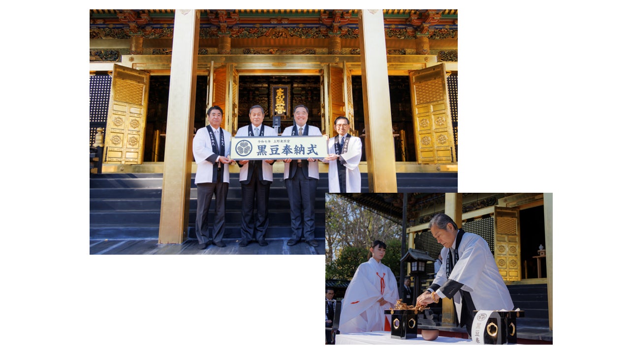 江戸時代に篠山藩から黒豆が徳川幕府に献上されていた史実に則り、初代将軍家康公、八代将軍吉宗公、十五代将軍慶喜公が祀られている上野東照宮に奉納いたしました。奉納式には、徳川宗家第19 代当主である徳川家広氏や俳優・松平健氏にもご参加いただき、新穀の豊穣を報告するとともに、来年のさらなる豊作と、黒豆生産者や関係者の無病息災をご祈祷いたしました。