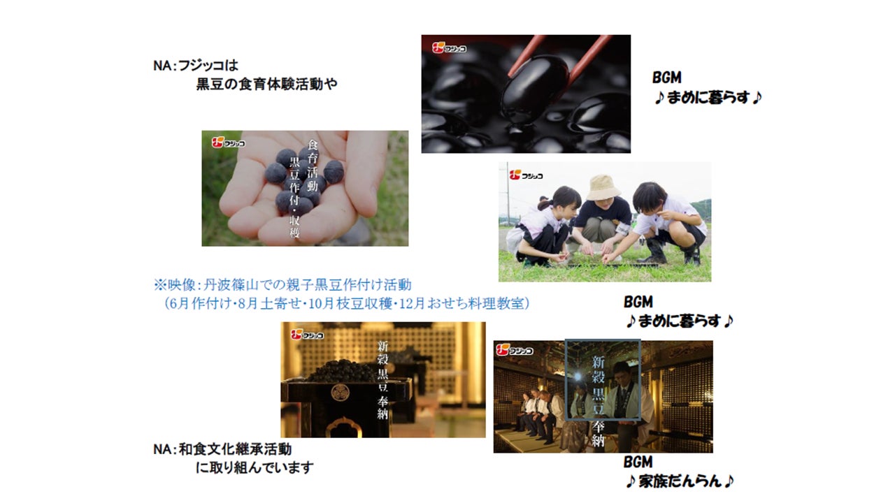 これらのリアルイベントとの連携を図るため、年末に放映している「丹波黒黒豆」のテレビCM を、これまでの商品訴求中心の内容から、当社の社会貢献活動である「食育活動の取り組み」と「和食文化継承活動」の紹介を軸とする、公共性の高いCSR 広告に変更いたします。