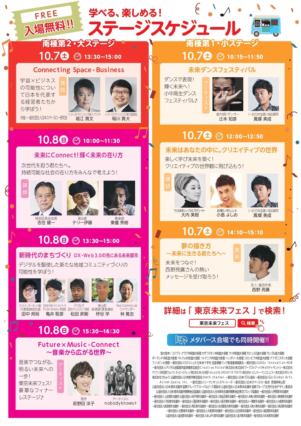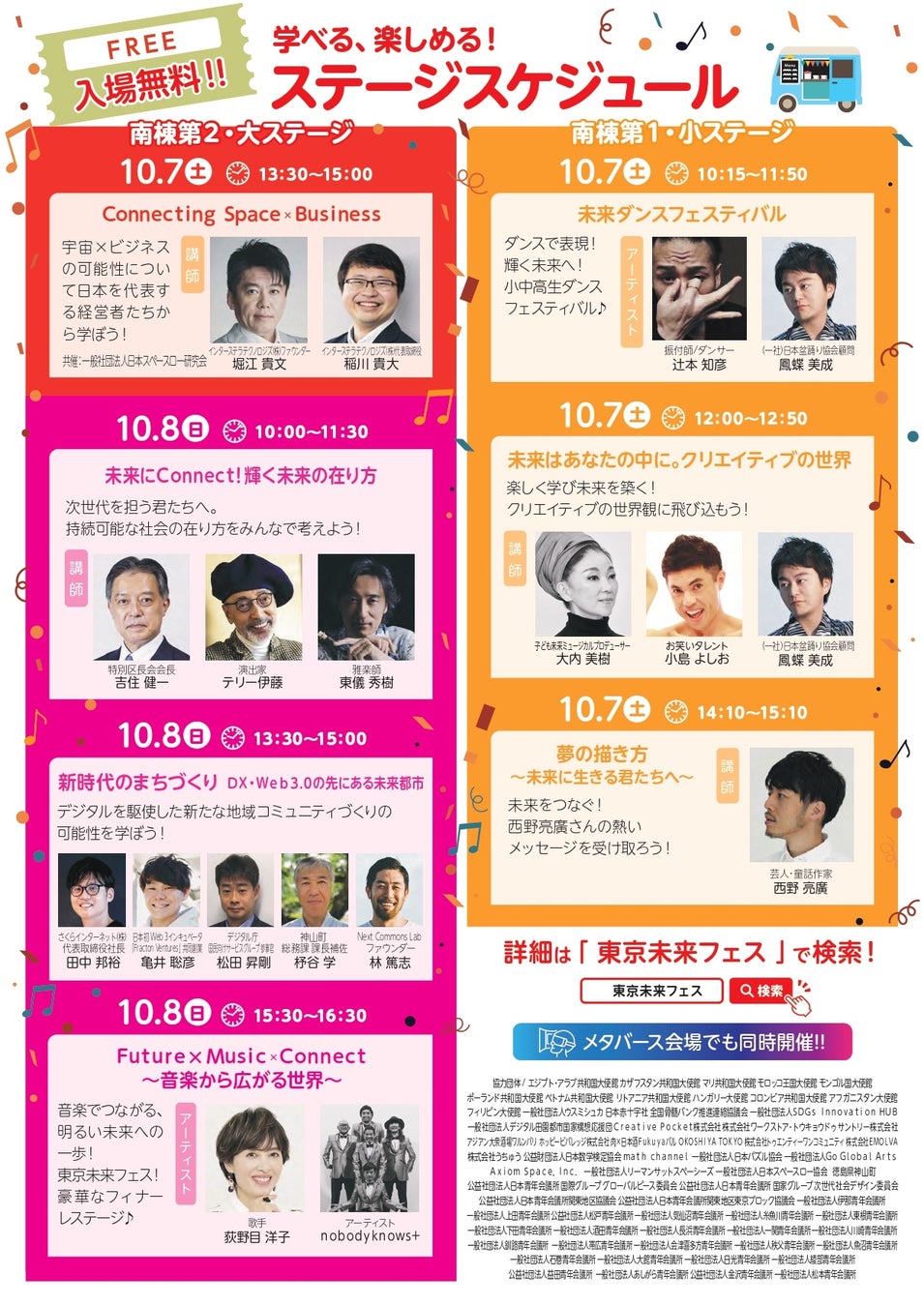 ステージコンテンツでは西野亮廣さんや堀江貴文さん、小島よしおさんなど豪華著名人が多数出演。 ご家族が楽しめる無料体験ブースや全国からのマルシェ、キッチンカーなど様々な出店企画が盛りだくさんです。