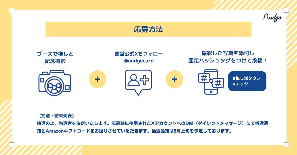 この度、ナッジは2024年7月20日(土)から7月21日(日)の2日間、原宿アルタで開催されるポップアップイベント「#推し活タウン」にて、ご来場者を対象に「X投稿キャンペーン」を実施いたします。本キャンペーンでは、抽選で10名様に3,000円分のAmazonギフトコードをプレゼントいたします。