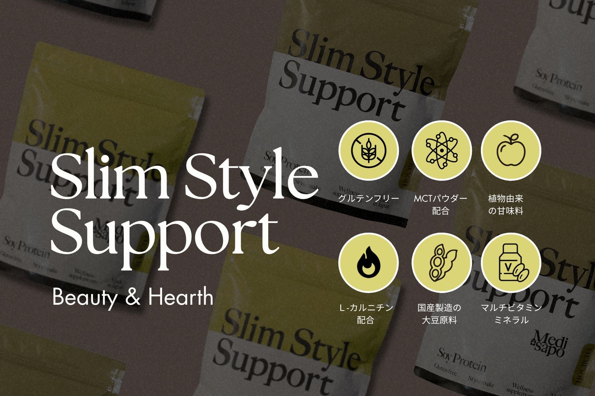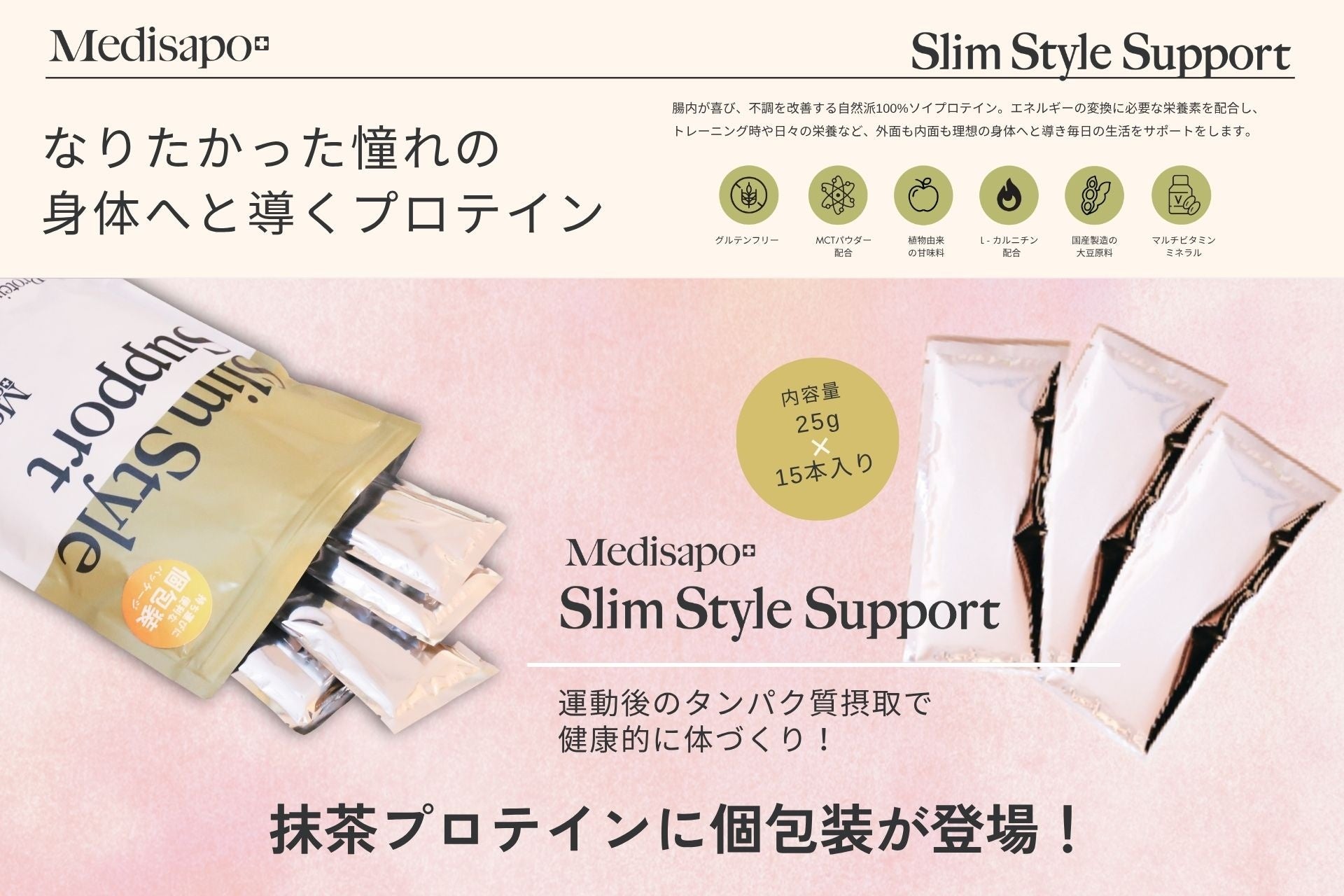 今回個包装版として新登場するのは、「Medisapo(メディサポ)」シリーズの中でも圧倒的な支持を集める「Slim Style Support(抹茶味)」(※以下SSS)。三大栄養素である タンパク質・糖質・脂質を効率的にエネルギーに変換するために必要な栄養素を配合し、代謝改善やダイエットサポートを求める多くのユーザーに愛用されている注目商品です。