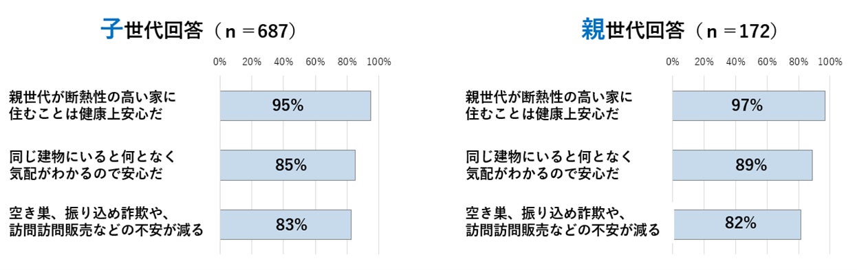 現在、同居している子世代は親世代のことを想う方も多く、「親世代が断熱性の高い家に住むことは健康上安心(95%)」「同じ建物にいて気配がわかって安心(85%)」「訪問販売等の不安減る(83%)」となりました。一方で親世代も「親世代が断熱性の高い家に住むことは健康上安心(97%)」「同じ建物にいて気配がわかって安心(89%)」「訪問販売等の不安減る(82%)」となっており、子世代・親世代ともに同居をすることで安心感を高く感じていることが分かりました。2024年には、匿名・流動型犯罪もニュースで大きく報じられ、一人暮らしの高齢者宅が多く狙われていることからも、同居により親子が一つ屋根の下に暮らすことが、精神的にも安心感をもたらすのではないかと思われます。