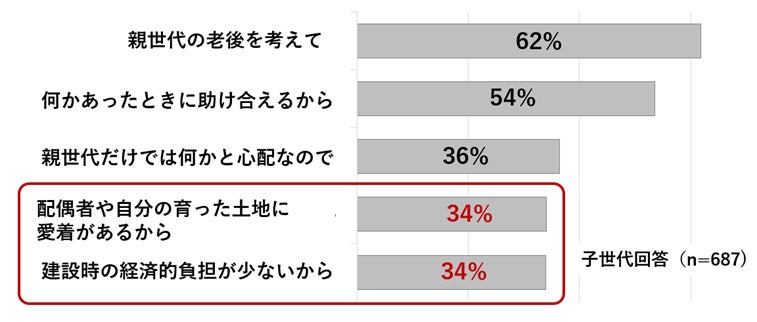 子世代の同居の理由として、新たに「自分や配偶者が育った土地に愛着があるから」の回答が34%あり、経済的メリットと同様に土地への愛着があることが分かった