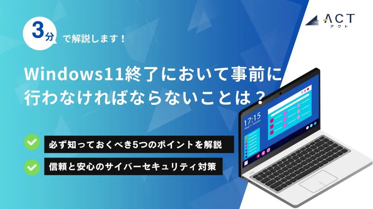 今年30周年を迎え、サイバーセキュリティ事業などを行う株式会社アクト(本社:東京都文京区、代表取締役CEO 小林 智彦 、以下 アクト)は【3分で解説!Windows11終了において事前に行わなければならないことは?】のホワイトペーパーを公開しました。