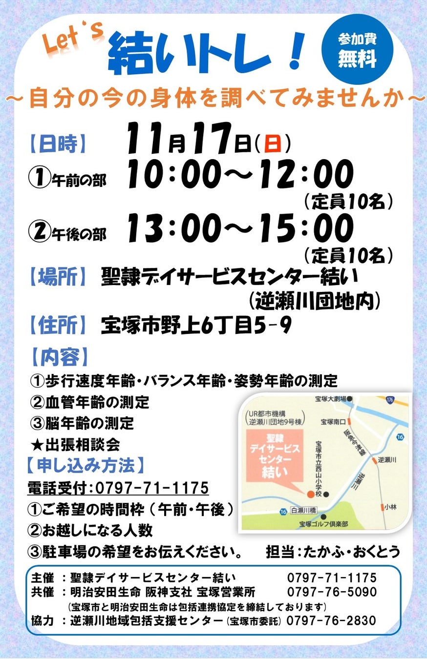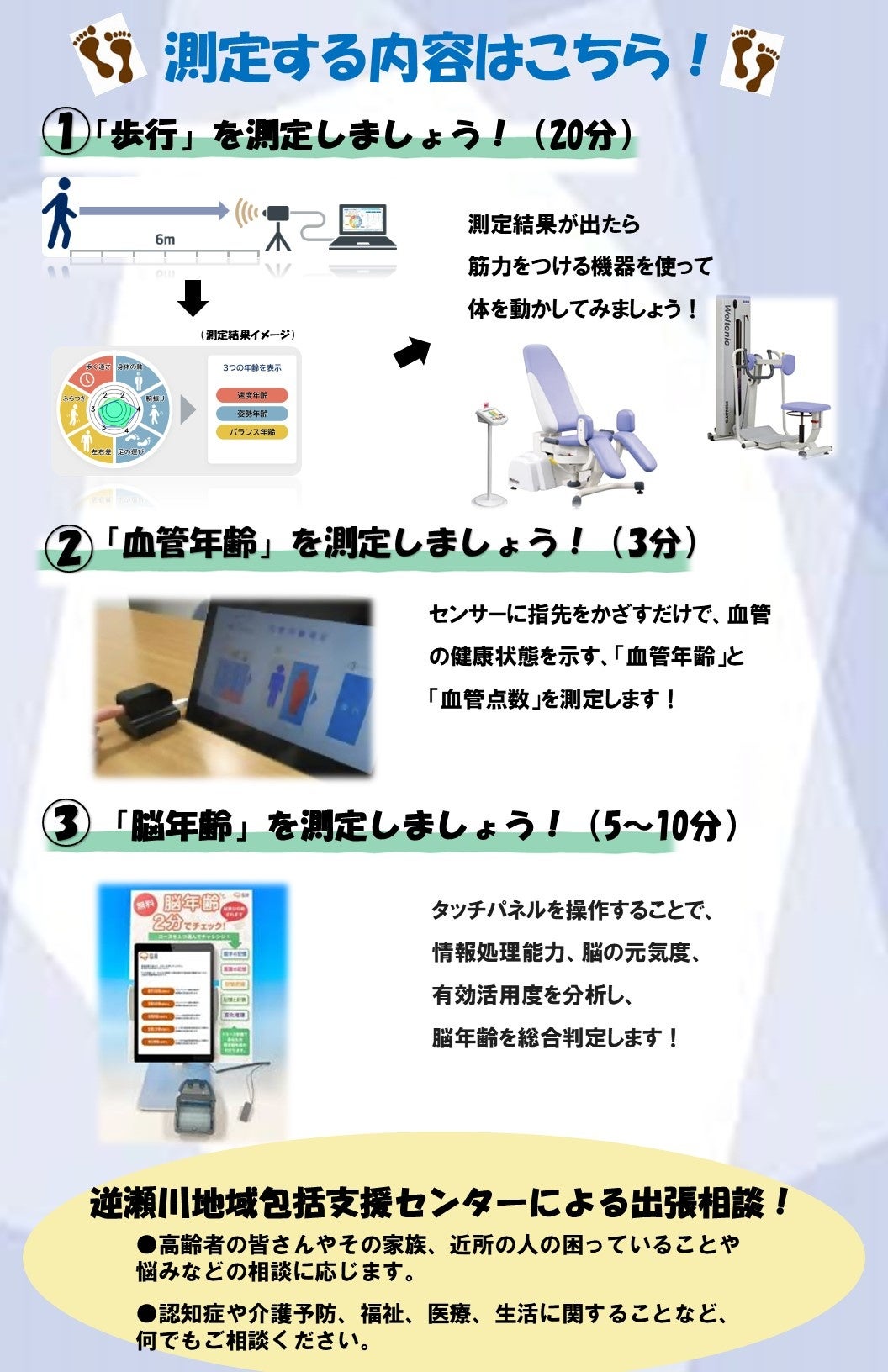 今回はリハビリ機器体験と測定(歩行速度年齢・バランス年齢・姿勢年齢)に加え、脳年齢の測定、血管年齢の測定を、明治安田生命阪神支社宝塚営業所(宝塚市と明治安田生命は包括連携協定※1を締結)と共同開催します。