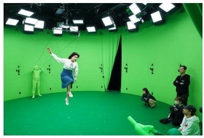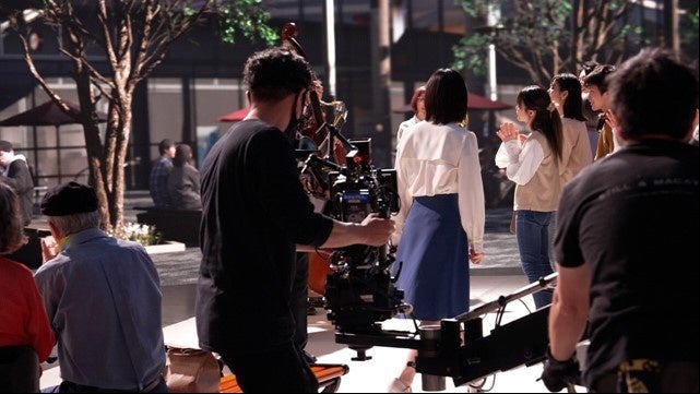 背景になる3DCGで作成した映像と現実のヒトやモノを同時に撮影する手法は、「バーチャルプロダクション」のなかでも「インカメラVFX」と呼ばれています。ソニーPCL株式会社が運営する「清澄白河BASE」(東京都江東区)内にあるスタジオで撮影しました。
