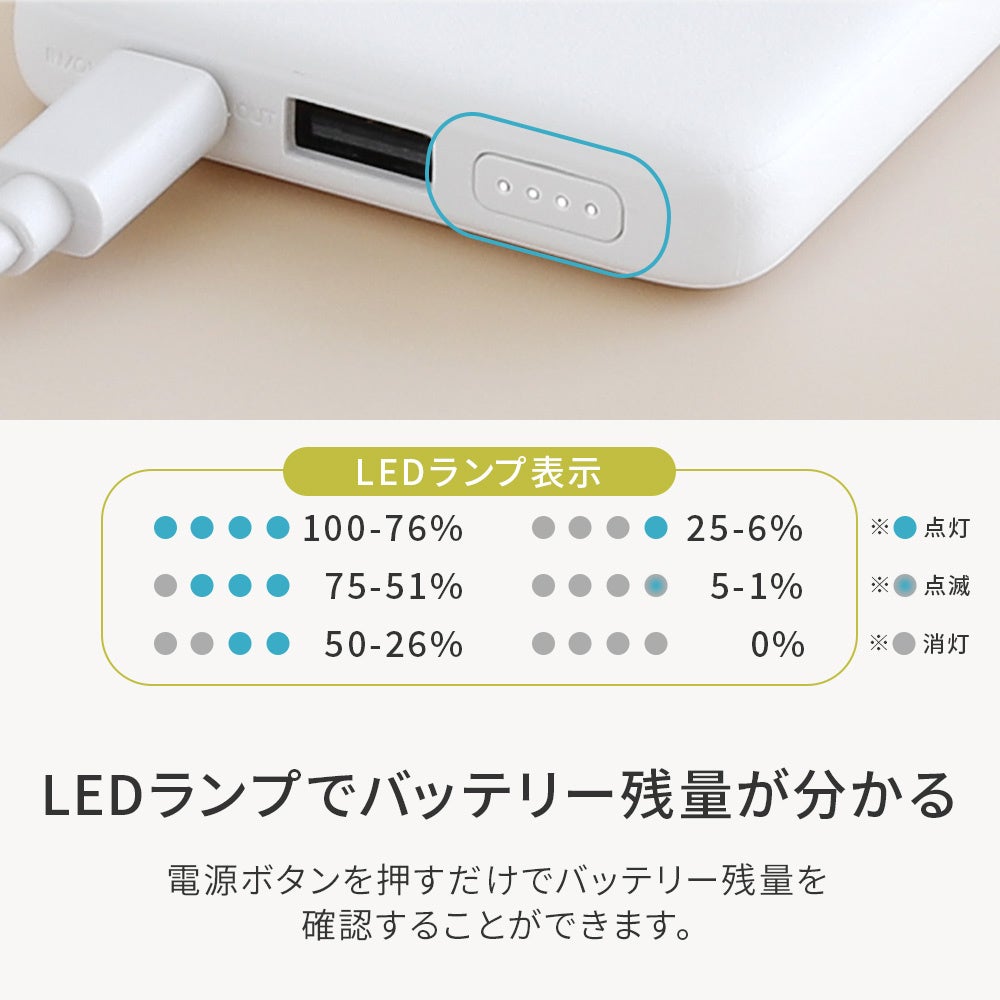 バッテリー残量が感覚的に分かるLEDランプを搭載。モバイルバッテリーを充電するタイミングが一目で確認できます。