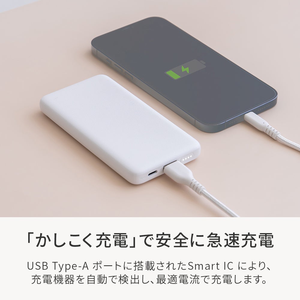 『かしこく充電』は接続した機器に応じて、出力する電流を切り替える仕組みです。この仕組みによって、USB Type-Aポートに接続した機器に過剰な電流を流さず、安全に充電できます。