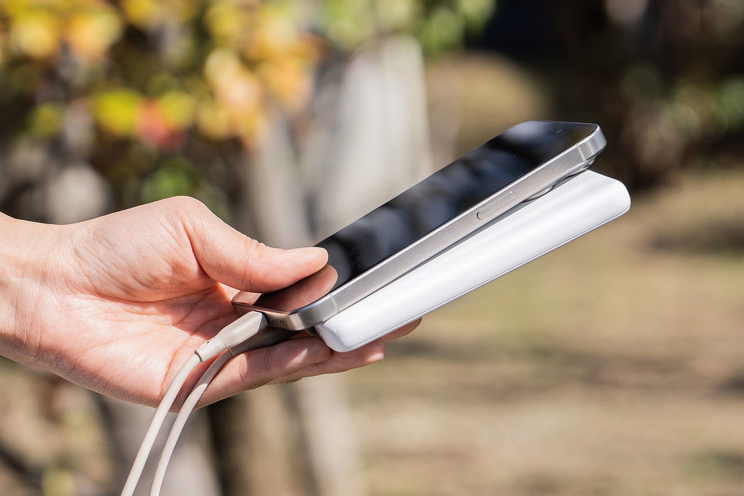 OWL-LPB5013は厚さ13.3mmの薄型モバイルバッテリーです。カバンにもさっと入る大きさで、iPhone 15と使えばちょうど重ね持ちができるサイズ感です。