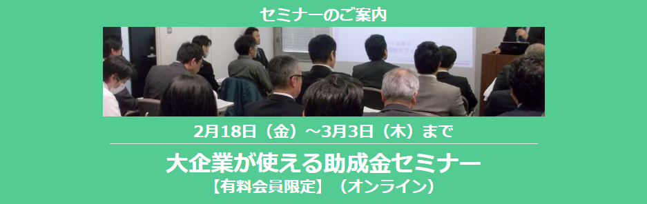 「大企業が使える助成金セミナー 2022年春版(オンライン)」を、2月18日(金)~3月3日(木)まで期間限定でお届けいたします。