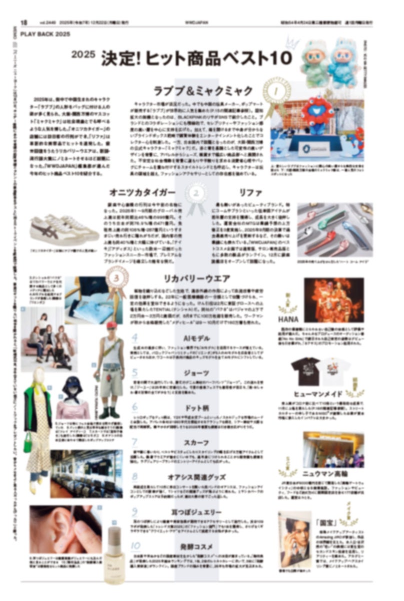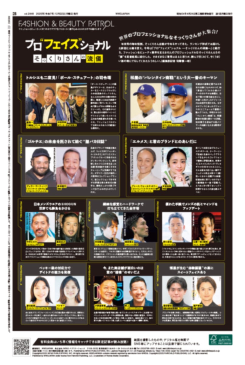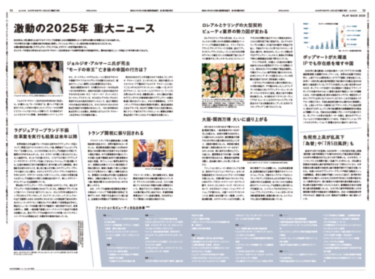 特集外では、年末最終号らしく激動の25年重大ニュースを振り返ります。世間を賑わせた大阪・関西万博やトランプ関税の話題はもちろん、ファッション業界でも“モードの帝王”ジョルジオ・アルマーニ氏の死去や大混乱を招いた「シーイン(SHEIN)」のパリ百貨店出店問題など、様々なニュースがありました。忘年会や新年会の話題のためにも、もう一度おさらいしてみてはいかがでしょうか。