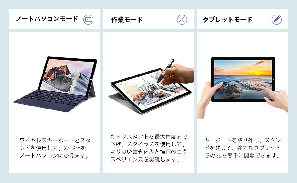厚さはわずか8.5mmで、重量は約860gのフルメタルボディでどこに行っても持ち運び便利です。また、さまざまな環境のニーズに簡単に対応できる無段階調整キックスタンドがあります。135度までに調整可能のキックスタンドを持ち、好きな角度を自由に調整することができます。(√√注:キーボード/スタイラスは含まれません、別途ご購入ください。)