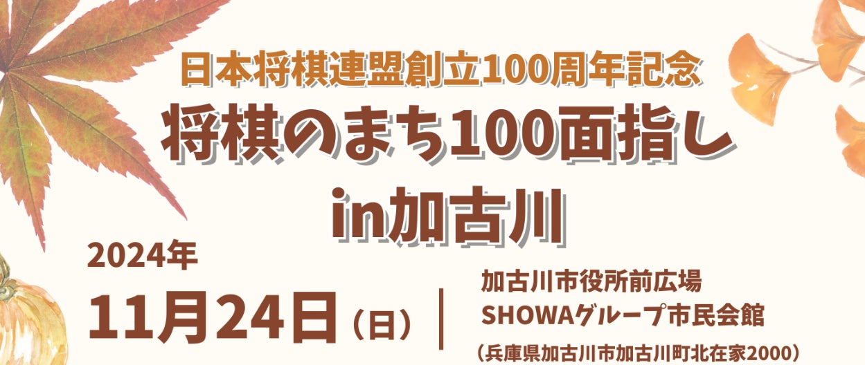 このたび、日本将棋連盟が創立100周年を迎えたことを記念して、11月24日(日)に加古川市役所前広場・SHOWAグループ市民会館にて「将棋のまち100面指しin加古川」を開催いたします。それに伴い11月11日(月)まで100面指しの参加申し込みを受け付けています。なおトークショーなど席上イベントの観覧については申込不要です。
