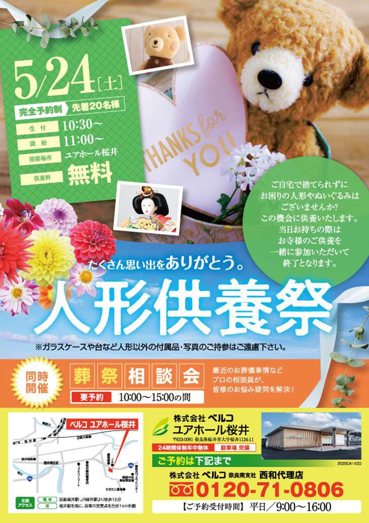株式会社ベルコ ユアホール桜井では、2025年5月24日(土)に「人形供養祭」を開催いたします。長年大切にしてきた人形やぬいぐるみに感謝の気持ちを込めて、供養する機会を提供いたします。