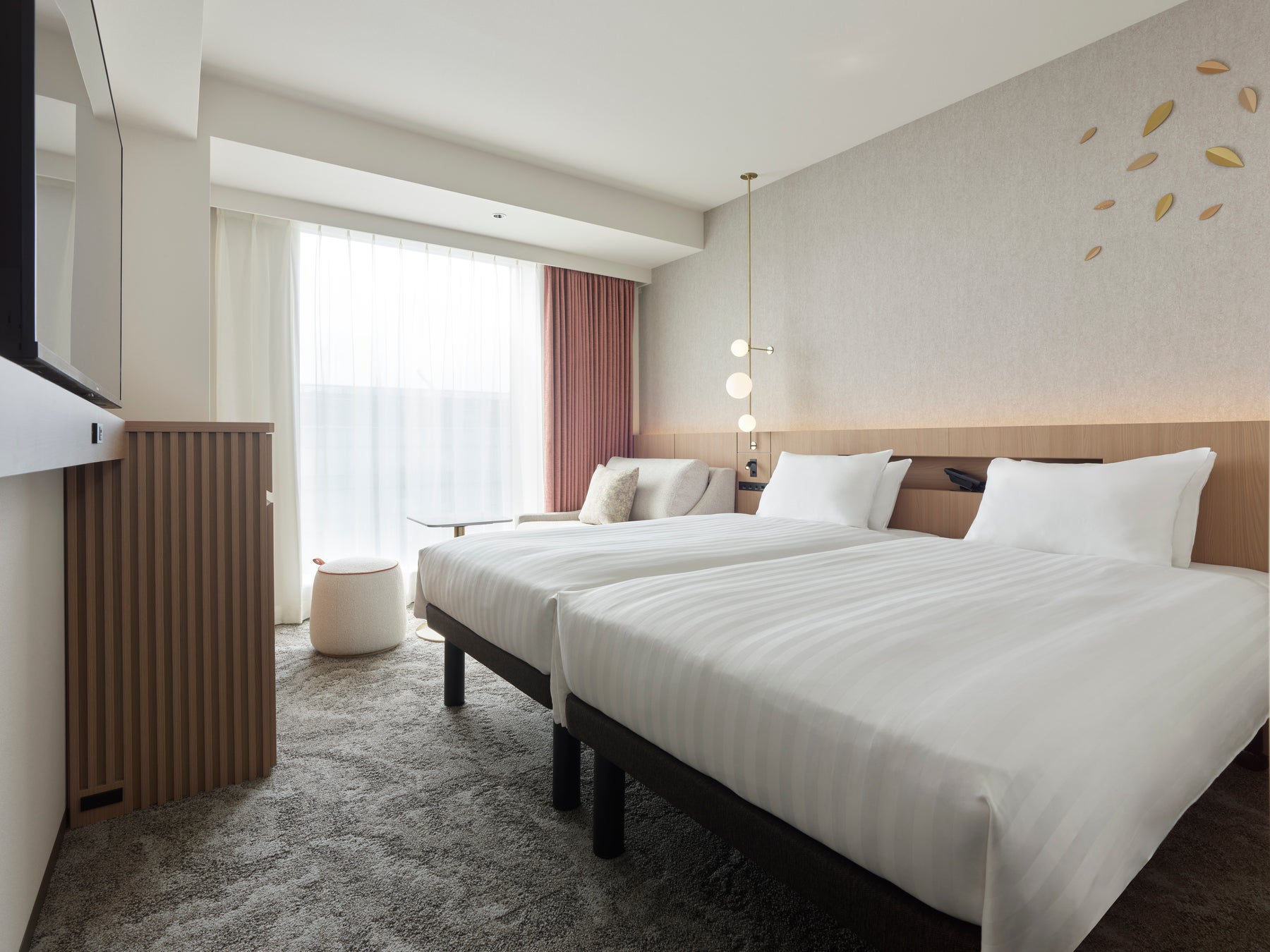 お客様のニーズが多様化していることを受け、様々な滞在シーンに対応できる客室構成とし、グループやファミリーでご利用いただきやすいツインルーム、トリプルルームを増設。また、フォースルームルームを新設し、3~4名でご宿泊いただける客室を2室から34室に大幅に増設いたしました。全客室の内装・家具・備品を一新し、ゲストがゆったりとくつろげるような色調とデザインにリニューアル。インテリアカラーは、客室タイプによって異なるカラースキームを採用しており、多くの客室では陽だまりをイメージした暖色系、30㎡以上の客室では木陰の涼しさをイメージした寒色系を取り入れています。また、定禅寺通りのケヤキ並木の葉をイメージしたアートを設置し、空間に自然の温もりを表現しました。バスルームは表装を更新し、洗面台やトイレなどの設備を交換することで、清潔感と機能性を向上させました。