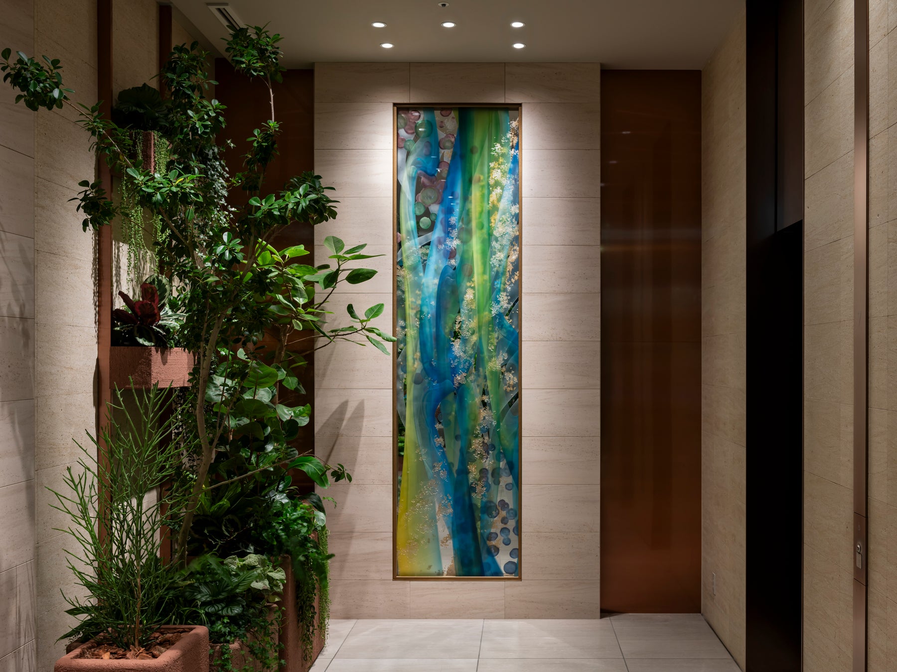 1階エレベーターホールには、杜の木々の間からこぼれ落ちる光をイメージしたチタン製のアートを設置しており、見る角度や光の当たり具合によって多彩な表情を楽しむことができます。7階エレベーターホールには、仙台の自然をテーマに、ケヤキの葉の瑞々しさ、萩の花の可憐さ、大滝の水のきらめきを一体化させたガラス製のアートを設置しました。また、7階ロビーの本棚には、東北にゆかりのあるアーティストによるオブジェを展示しています。