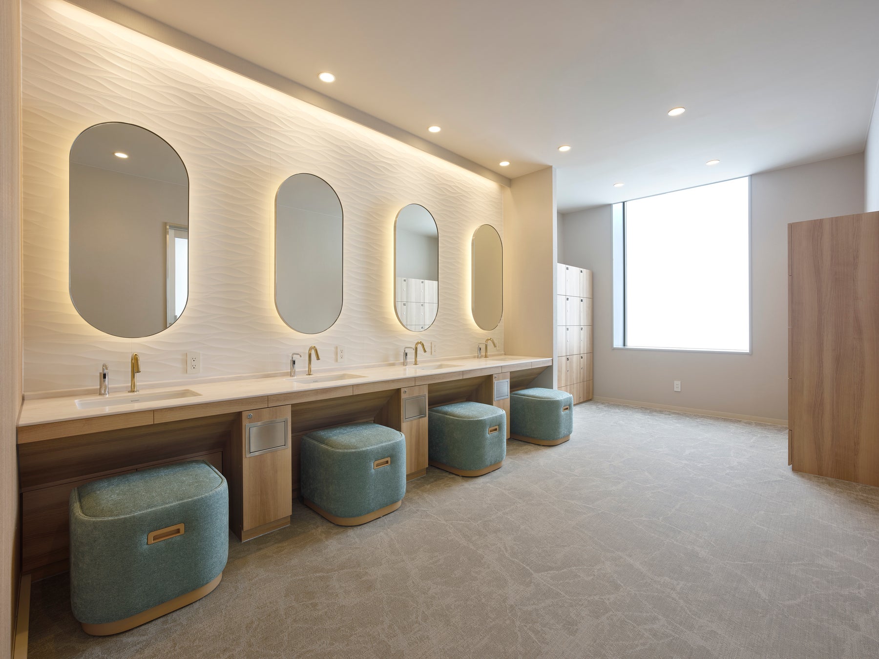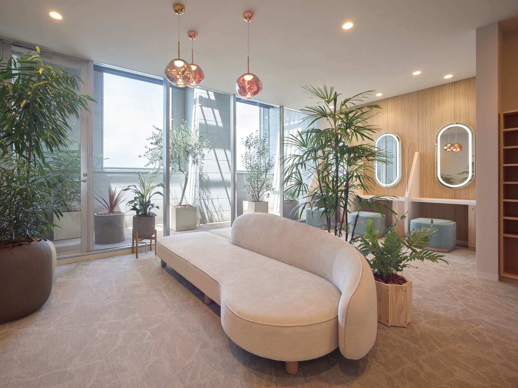 混雑を避け、ゆったりとご利用いただけるように、女性用大浴場では浴室内の洗い場を計8箇所(カラン7箇所・シャワーブース1箇所)に増設いたしました。また、女性用パウダールームを拡張し、ゆとりあるスペースを確保。リニューアル前からご好評いただいている「お好みのシャンプー・トリートメントをお選びいただけるコーナー」も引き続きご用意しております。