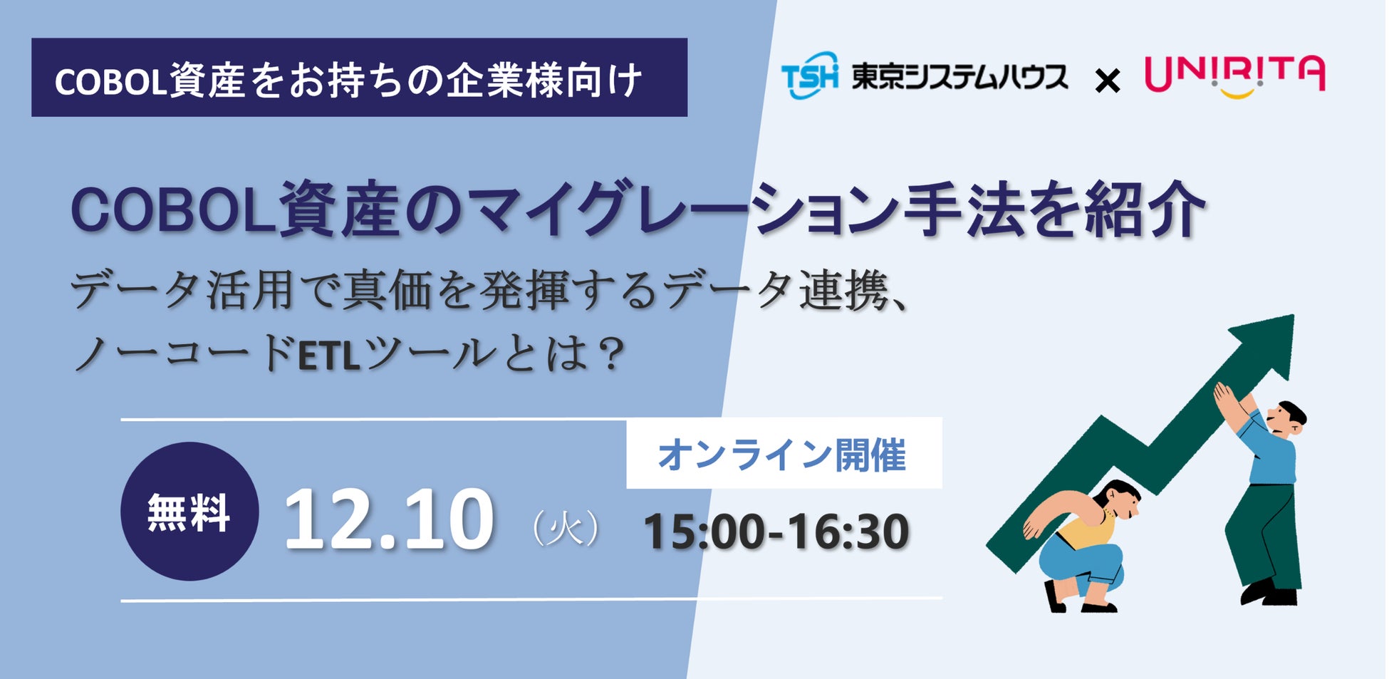 株式会社ユニリタ(本社:東京都港区、代表取締役 社長執行役員:北野 裕行、東証スタンダード市場:3800、以下 ユニリタ)は、東京システムハウス株式会社(本社:東京都品川区、代表取締役:林 知之、以下 東京システムハウス)と協同で、オンラインセミナー「COBOL資産のマイグレーション手法を紹介~データ活用で真価を発揮するデータ連携、ノーコードETLツールとは?~」を2024年12月10日(火)15時より開催します。