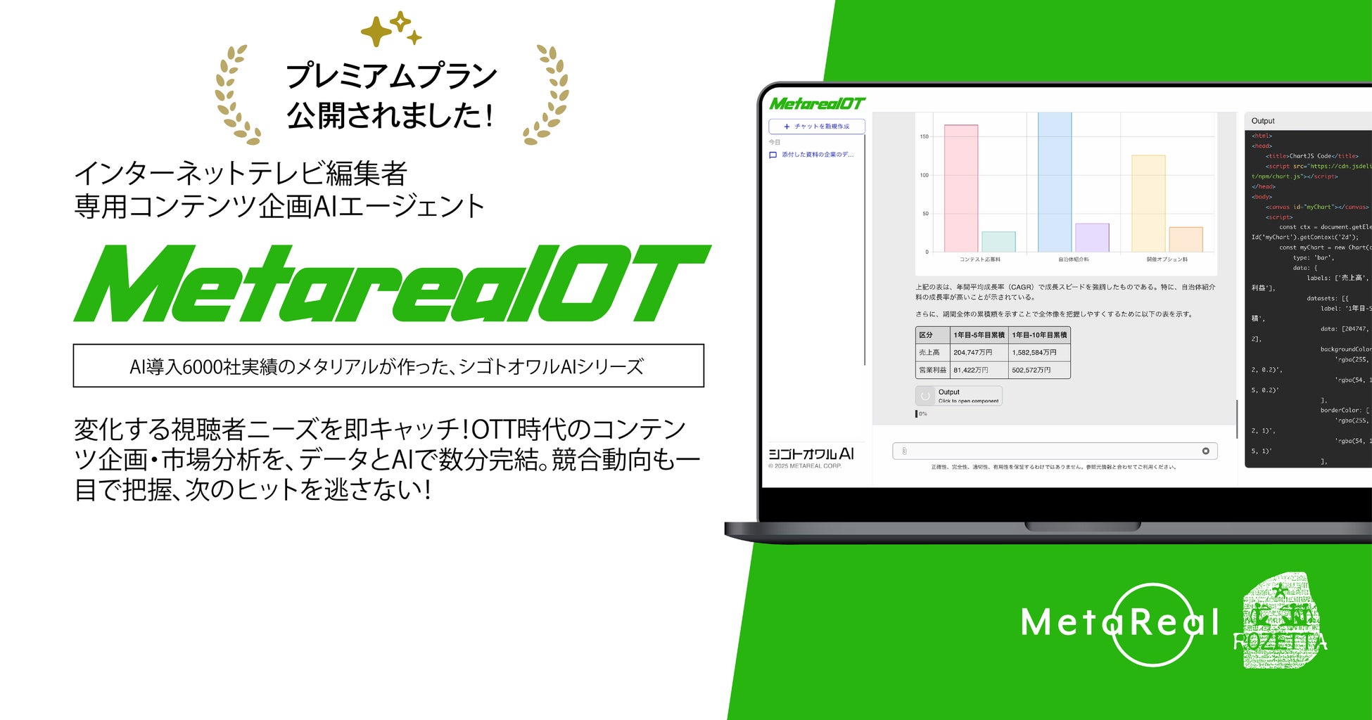 OTT企画現場に衝撃。月額5万円で“AI参謀”を迎える『Metareal OT』プレミアムプラン7月2日提供開始