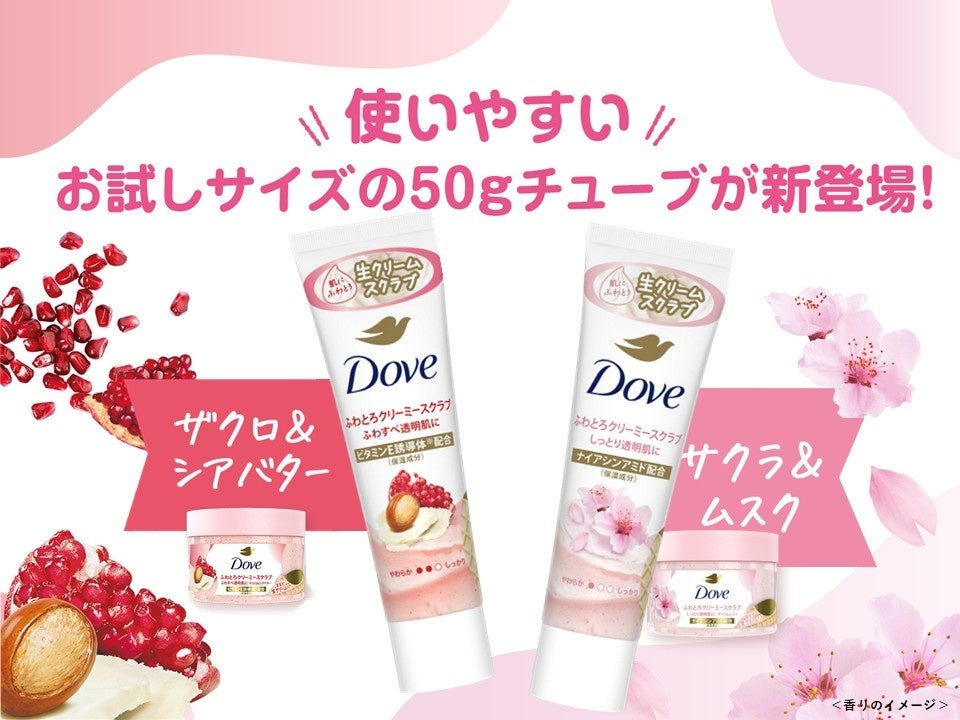 まるで生クリームのようになめらかな“ふわとろ“テクスチャーが人気の「ダヴ ふわとろ クリーミースクラブ」シリーズ。豊富な香りや成分から自分の肌に合ったものを選べるだけでなく、古い角質をやさしくオフしながら保湿ケアもできるポイントがSNSでも話題になり、好評いただいています。今回、より多くの方に気軽にスクラブを取り入れていただきたいという思いから、特に人気の2種類がミニサイズのチューブタイプになって新登場します。