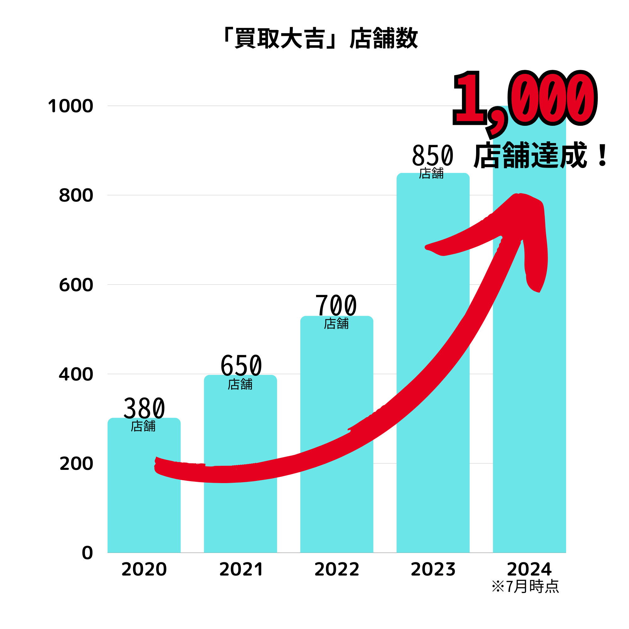 <『買取大吉』店舗数の推移> 2020年:店舗数302 2021年:店舗数398 2022年:店舗数530 2023年:店舗数850 2024年7月20日時点:店舗数1,000 ※直営店舗・フランチャイズ店舗合算 |