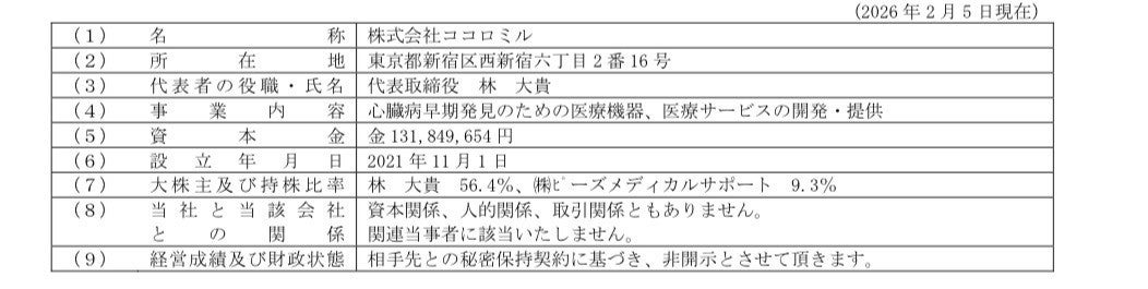 2026 年2 月中旬、第三者割当の方法により、マーチャント社がココロミル社の普通株式を1 株当たり2,599 円で19,500 株(総額50,680 千円、第三者割当増資後の発行済株式数1,647,479 株の1.2%)を取得いたします。