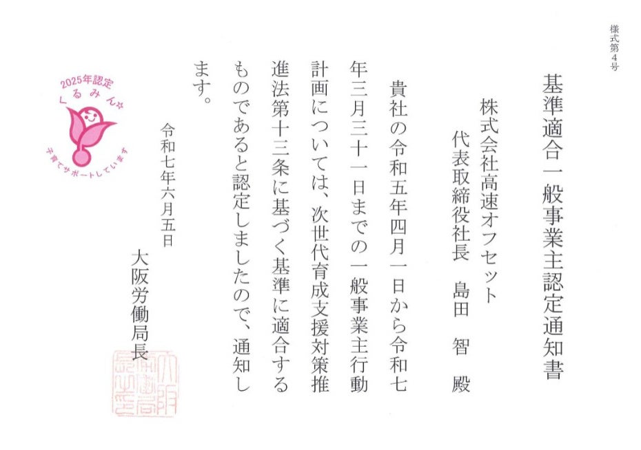 株式会社高速オフセット(本社:大阪市西区、代表取締役:島田智)は、厚生労働省より子育てサポート企業として、6月5日、「くるみん認定」を取得しました。