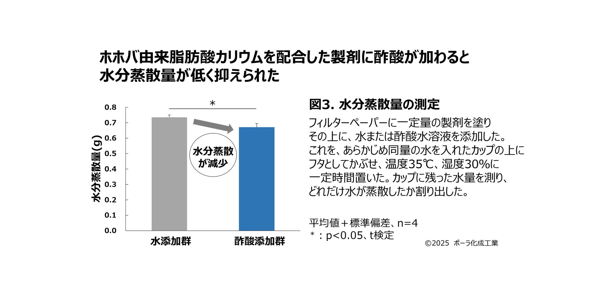 ホホバ由来脂肪酸カリウムを配合した製剤について、酢酸によるpH変化により水分蒸散抑制効果が実際に向上するか評価しました。その結果、酢酸水溶液の添加で水分蒸散量を抑える作用が向上することが確認できました(図3)。酢酸によるpH変化で形成された脂肪酸の膜が水をはじく力を発揮しているものと考えています。