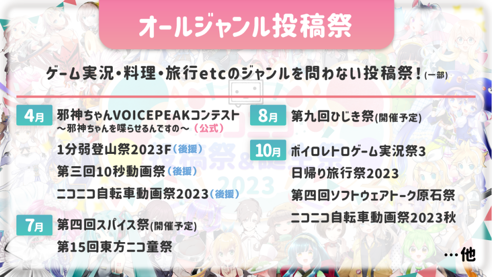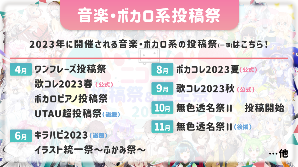 - ニコニコ内の多種多様な投稿祭・誕生祭の開催情報を集約、年に2回、ボカコレ最終日に発表