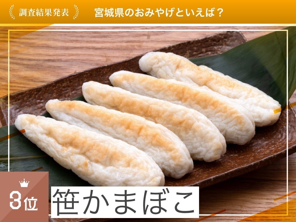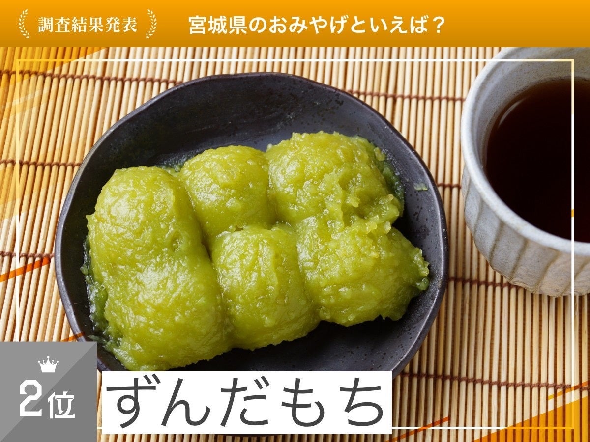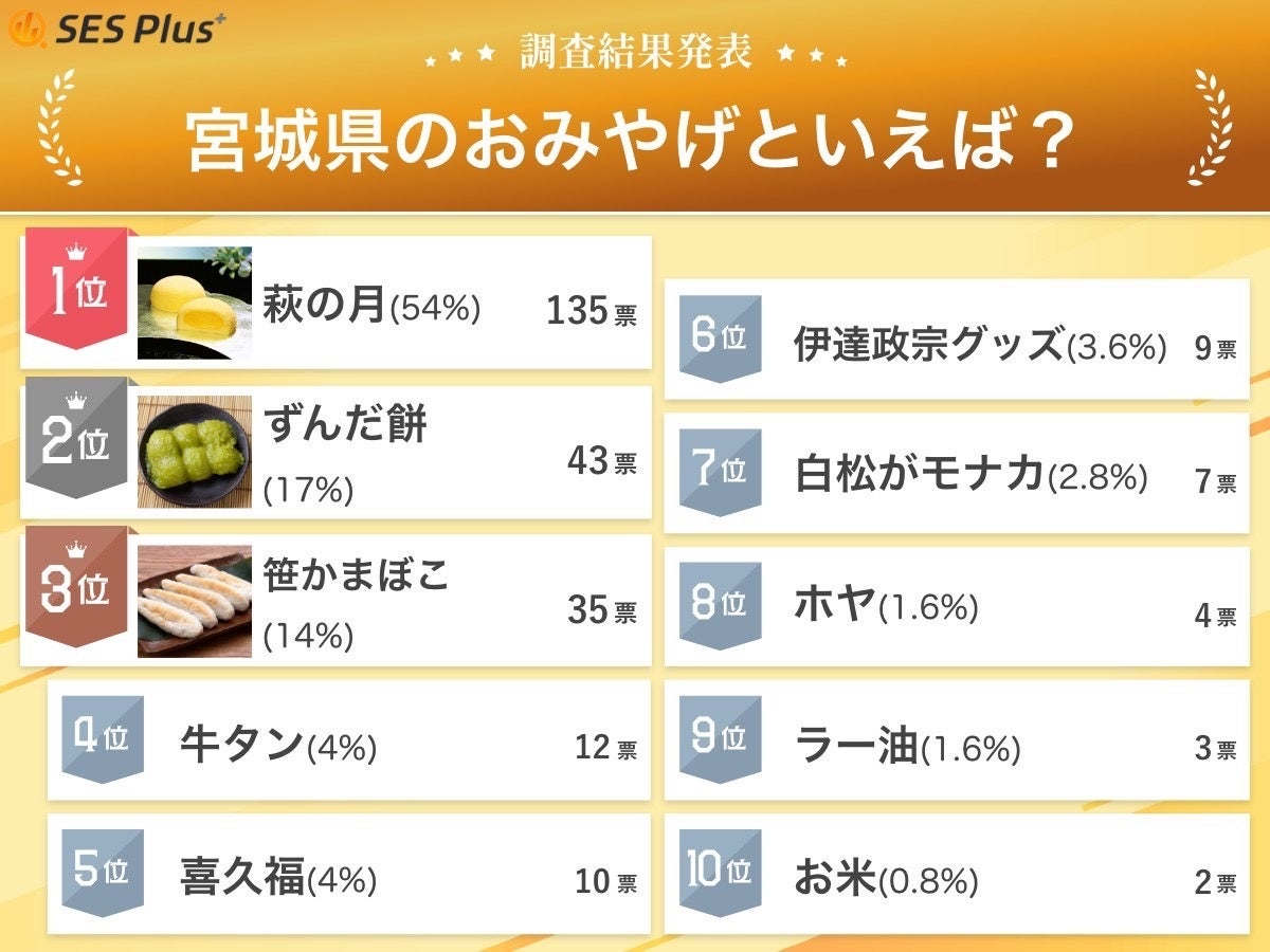 約250人の宮城県ファンに「宮城県のおみやげといえば?」をアンケート調査したところ、1位「萩の月(135票)」、2位「ずんだ餅(43票)」、3位「笹かまぼこ(35票)」という結果になりました。