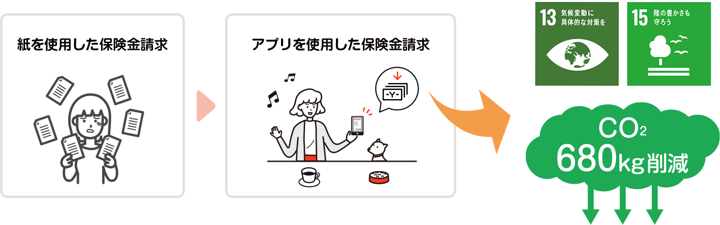 アニポスアプリを使用した保険金請求が増えることはペーパーレス化にも貢献し、アニポスアプリを利用せず紙での保険金請求を行った場合と比較して680kgのCO2削減にもつながっています(当社調べ)。