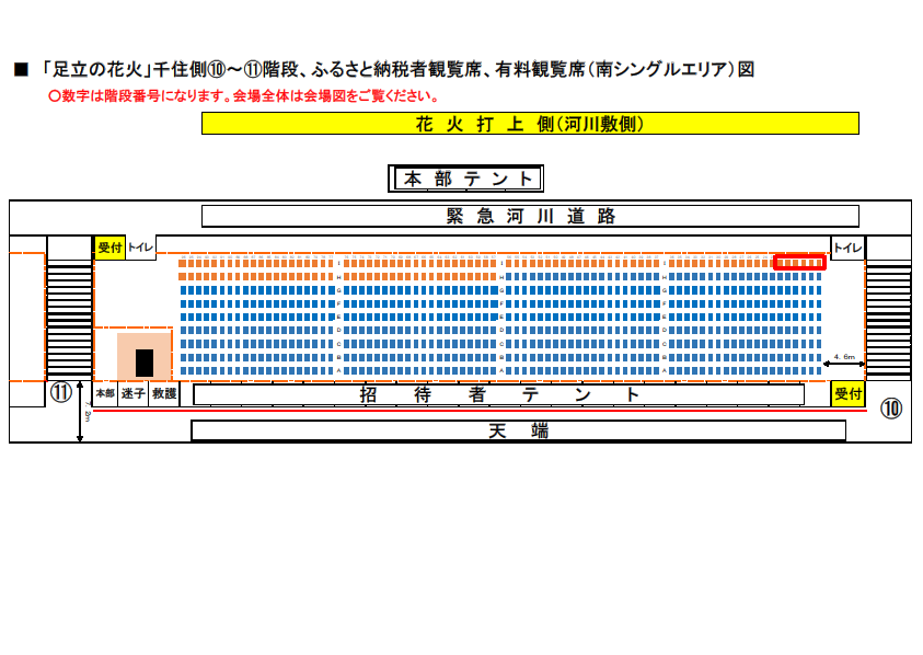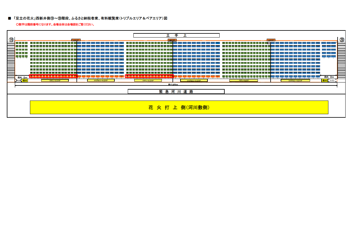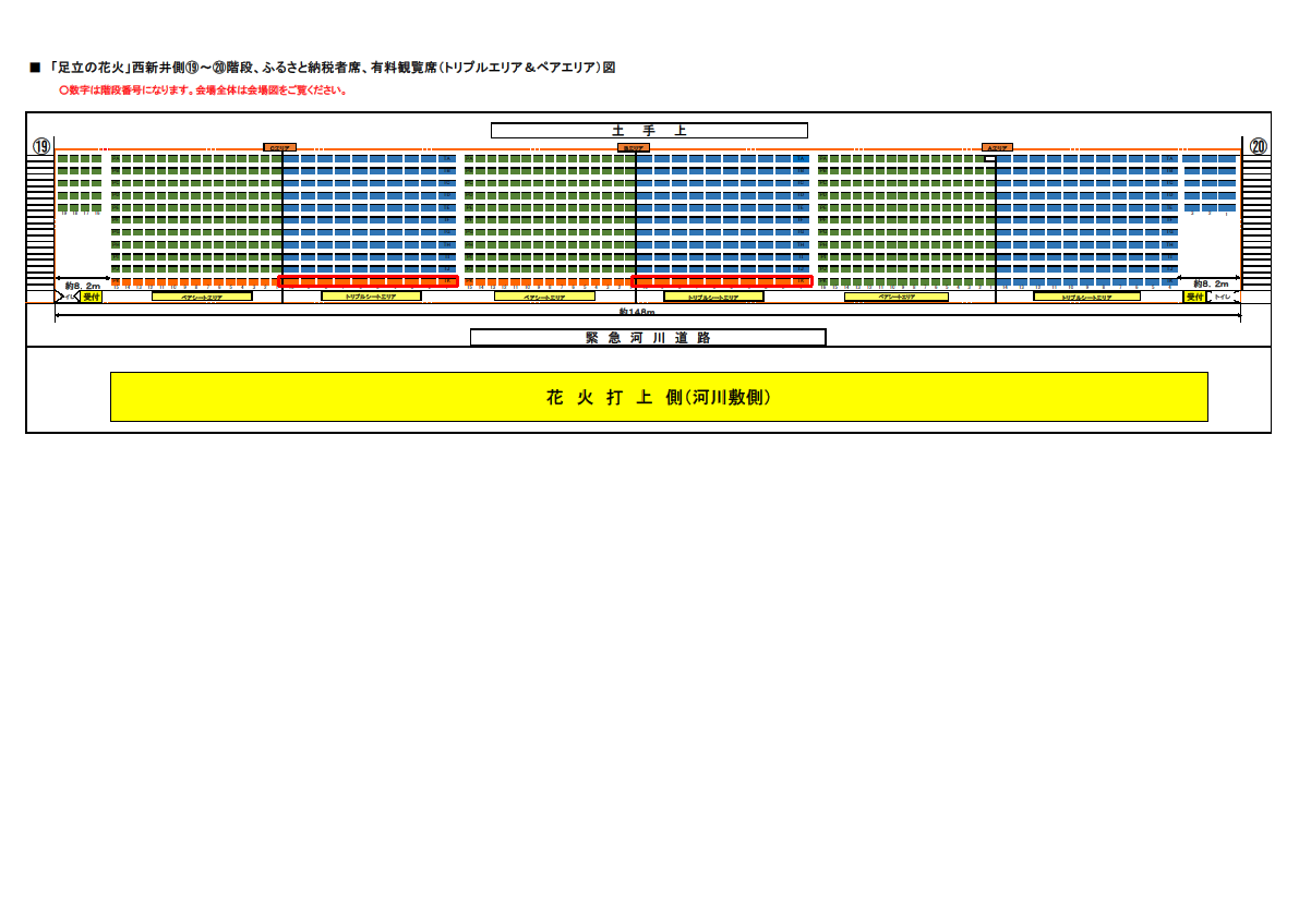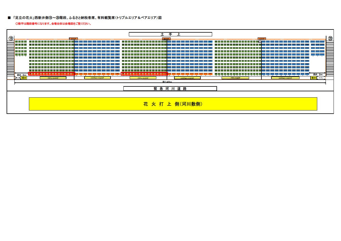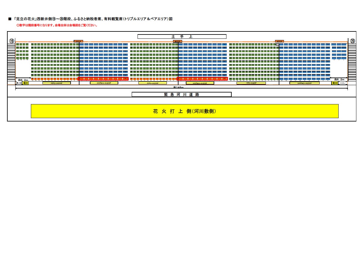 観覧席は、打ち上げポイント目の前で大迫力の花火を体感できる千住側「南シングルエリア(シート敷)」や、打ち上げポイントの対岸でワイドに打ち上がる花火の全景をゆったりと観覧できる西新井側「北シングル席(イス)」「ペアエリア(シート敷)」「トリプルエリア(シート敷)」「4人がけテーブル席」をご用意しました。