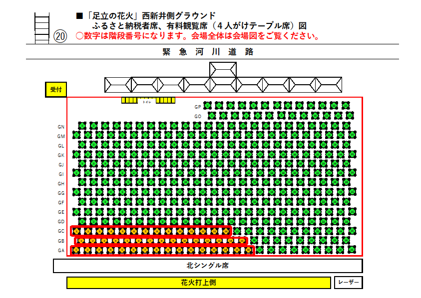 【西新井側 4人がけテーブル席 GA列1-16、GB列1-15、GC列1-14】