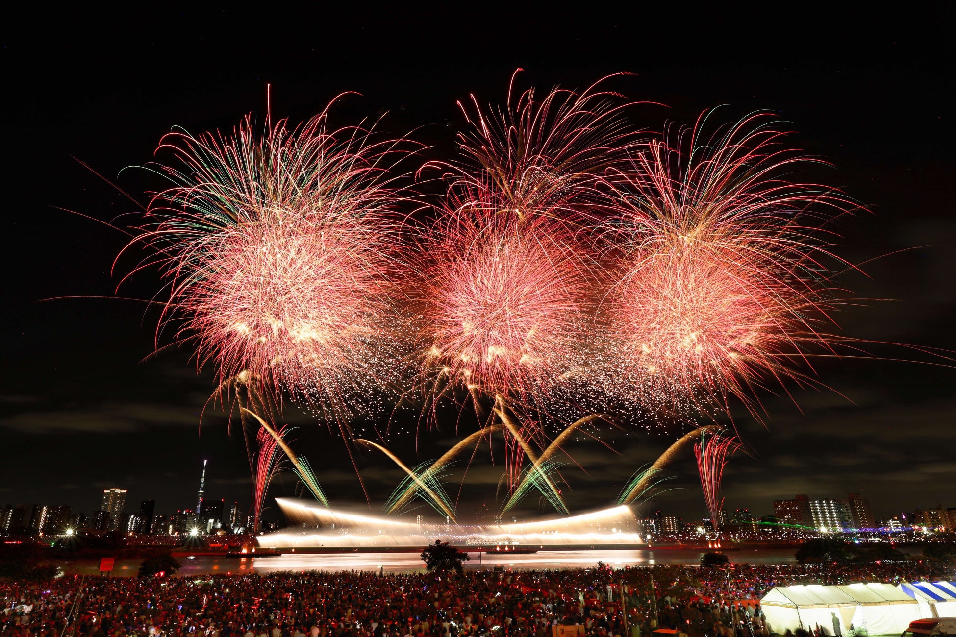 場所取りの心配なく、広々とした荒川河川敷で腹の底まで響く迫力の花火を心ゆくまで味わってください。