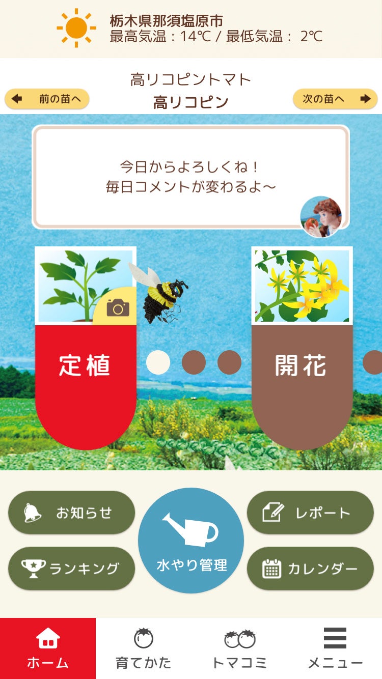 当社が2020年に開発したトマト栽培サポートアプリ「トマサポ!」。アプリを通じて水やりなど、トマト栽培を成功に導くガイダンスを写真やイラスト、動画で分かりやすく解説し、栽培初心者でも失敗しないよう支援いたします。育てる品種や栽培場所の天気予報データからその日の管理作業の助言もしてくれます。