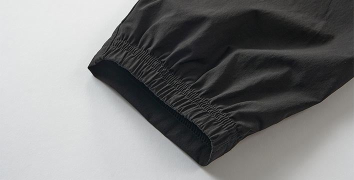 機能性とデザイン性を追求するために、縫製パターンをミリ単位で調整。また、裾にはばたつかないゴム絞りデザインを採用しています。細身でありながらも動きやすい、機能美あふれる一着です。