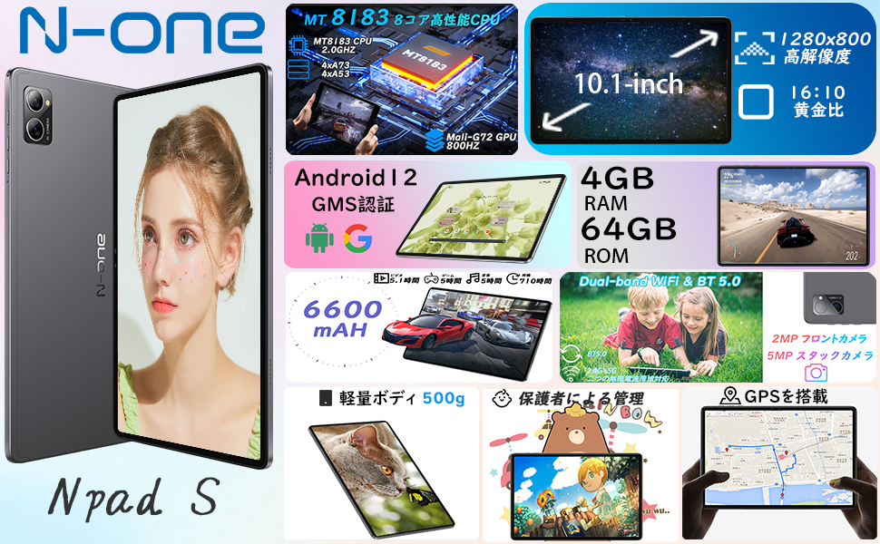 N-one NPad S タブレット、1200*800解像度 HD IPSディスプレイ、MTK 8183 8コアCPU 2.0GHz、1TB TF拡張可能+4GB RAM+64GB ROM、GMS認証+6600mAh大容量バッテリー+Type C充電+2.4G/5G Wi-Fi対応、 タブレット10.1インチ、Bluetooth5.0+GPS+2MP/5MPカメラ、日本語取扱説明書付き