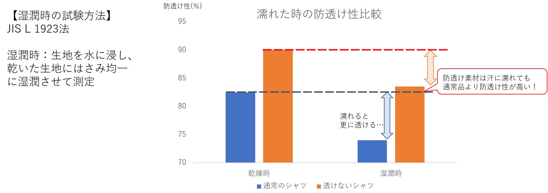 JIS L 1923 B法 防透け指数93.0は当社初で、医療用の白衣などと同レベルの防透け性を実現しています。