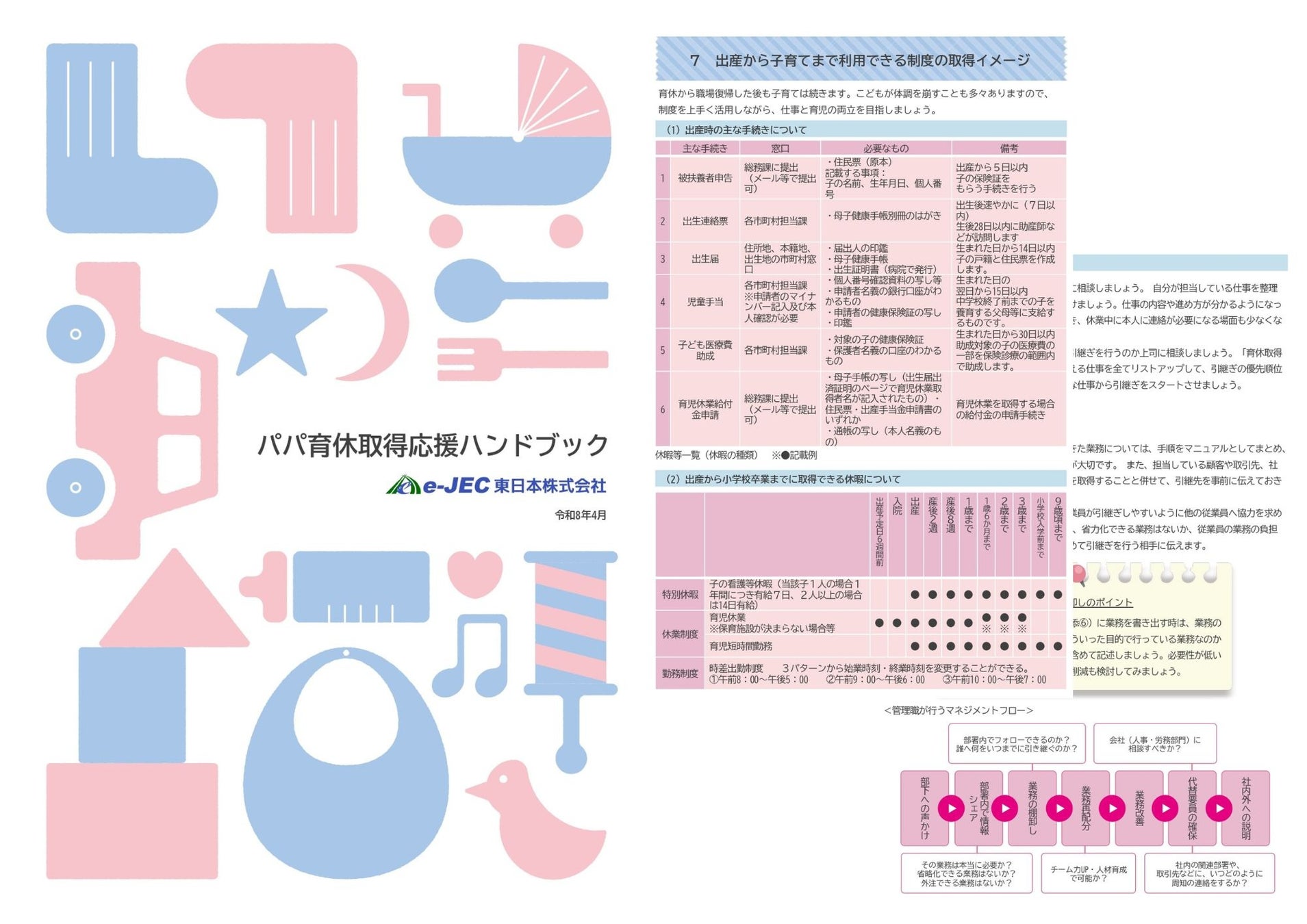 制度は整備されていたものの、これまでは対象者がいないため実際の取得に至っていませんでした。今後の若手社員の増加を見据え、トップメッセージの発信、育休制度をまとめたハンドブックの作成、申出様式や引継ぎフローの整理などを実施しました。