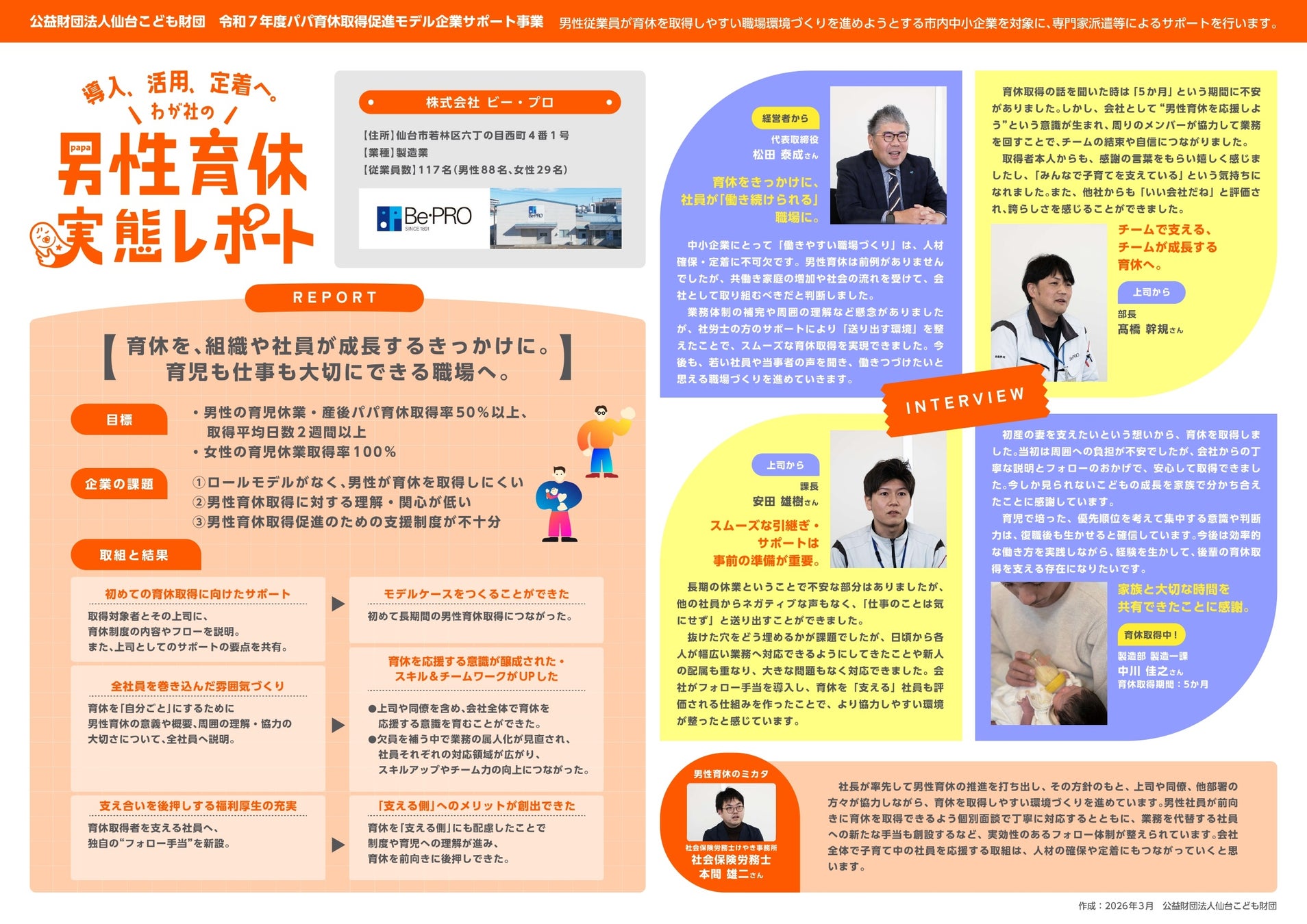 この事業は、当財団と社会保険労務士などの専門家が、各企業における男性育休を取得しやすい職場環境づくりの取組を支援するもので、このたび、令和7年度に本事業に参加した仙台市内の中小企業3社の取組成果をまとめたレポートを公開しました。