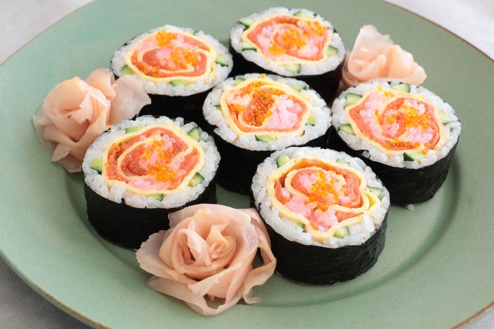 断面がきれいな薔薇の花に見えるよう、具材を置く場所がポイントとなる巻き寿司です。中の具材を薄焼きのたまごシート(おいしさつづく 四角いたまごシート)で巻き、ご飯を薄く広げた海苔の上にのせ、もう一度巻き上げます。