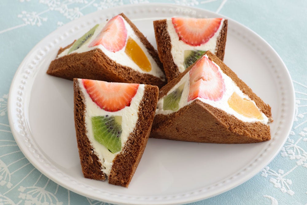 食パンの上にチーズクリームを塗り広げ、いちごや黄桃、キウイフルーツをのせ、サンドして作るフルーツサンドイッチです。切った際の断面に想像を膨らませながら、フルーツを置いていきます。