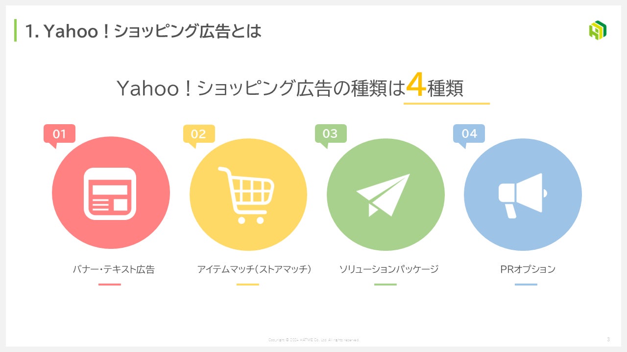 Yahoo!ショッピング広告には「バナー・テキスト広告」「アイテムマッチ(ストアマッチ)」「ソリューションパッケージ」「PRオプション」の4種類があります。